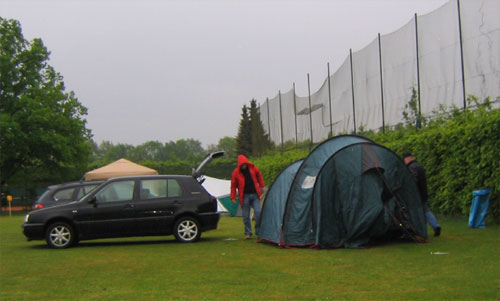 Rasen Sport Club Senioren in Bremen 19.-21.5.2006 Nunc est ludum - nunc est bibendum Zum 2. Mal nach 2004 fuhren die Senioren des Rasen Sport Club Wiesbaden zum Tukan Cup, der alle 2 Jahre von den "Tukans", den Senioren der Bremer Hockey Club, ausgerichtet wird. Die RSC Senioren haben es in ihrer kurzen Geschichte noch zu keinem Namen gebracht. Der "Dr.", unserer Mannschaftskapitän, kramte allerdings diesmal tief in der Kiste nur scheinbar verschütteter Lateinkentnisse und grub die oben stehende Begrüssungs- und Verabschiedungsformel aus. Damit konnten wir unsere Gegner schon vor den Spielen in Verwirrung stürtzen, was sicher massgeblich zu unseren Erfolgen beitrug. Anreise: Am 19.5. machten wir uns in 3 Autos auf die Reise. Je nach Abfahrtszeit und Route waren wir zwischen 4 und 6 1/2 Stunden unterwegs. Gerüchteweise soll der eine oder andere im Stau und bei heftigen Wind und Regen an Umkehr gedacht haben. In letzter Minute mussten wir noch die Absage unseres plötzlich erkrankten Vizepräsideten (und laufstarken Mittelfeldspielers, wäre auf Kunstrasen gegen TEC wichtig gewesen) Axel Schauf hinnehmen. Icke baut sein Zelt auf Get together: In Bremen angekommen wurden, in einer kurzen Regenpause, die Zelte aufgebaut und Bekanntschaft mit unserer von Markus Katterbach organisierten Verstärkung "Icke" Christian Cybulski geschlossen. Nach kurzer, aber intensiver Kennenlernphase, gingen wir zwischen 1:00 und 4:00 ins Bett mit der Perspektive am nächsten Tag um 11:10 mit den "Tukans" die Klingen zu kreuzen.